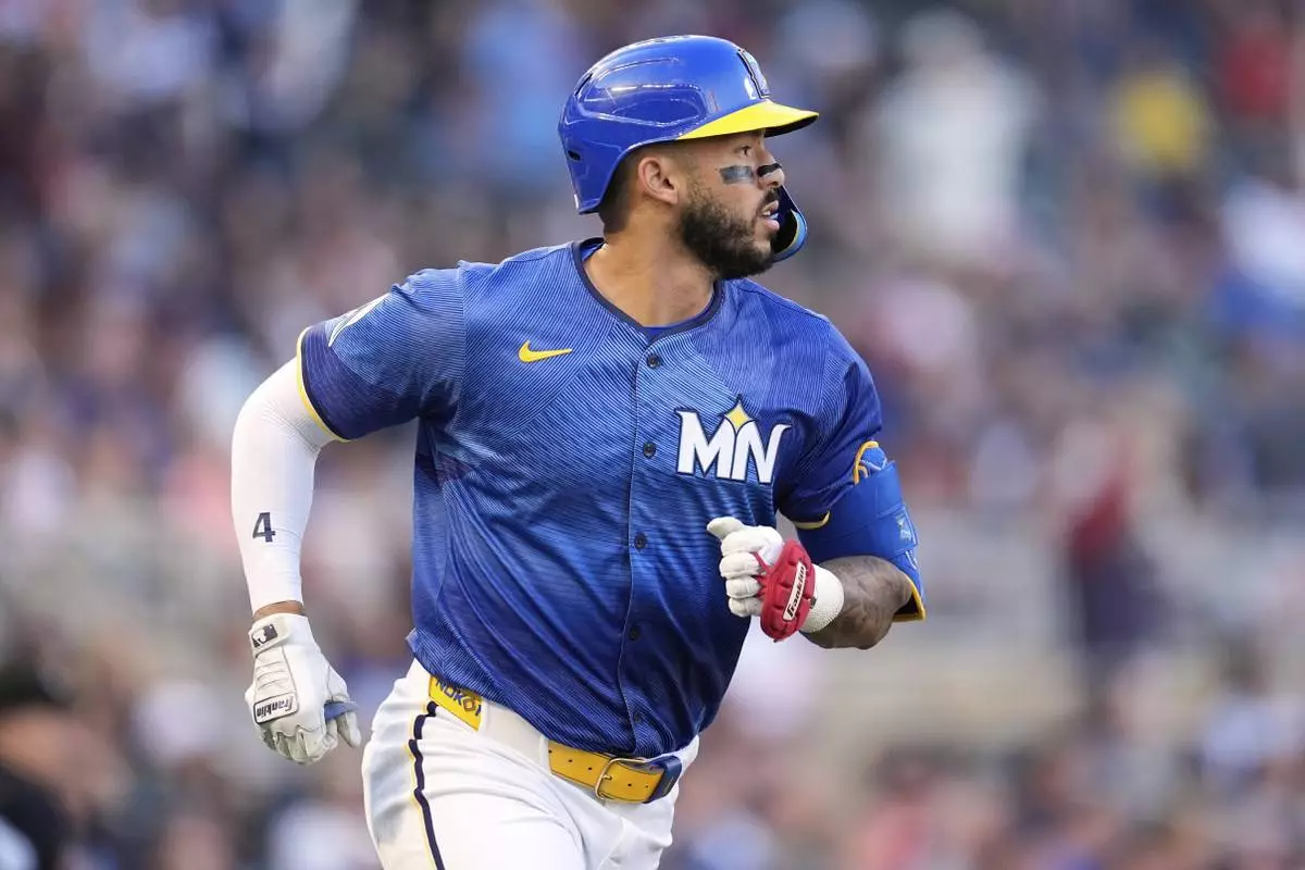 Minnesota Twins' Ty France celebrates after hitting a walkoff two-run home run during the ninth inning of a baseball game against the Kansas City Royals, Friday, May 23, 2025, in Minneapolis. (AP Photo/Abbie Parr)