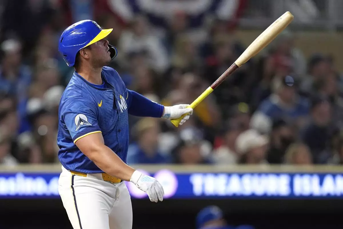 Minnesota Twins' Ty France watches his walkoff two-run home run during ninth inning of a baseball game against the Kansas City Royals, Friday, May 23, 2025, in Minneapolis. (AP Photo/Abbie Parr)