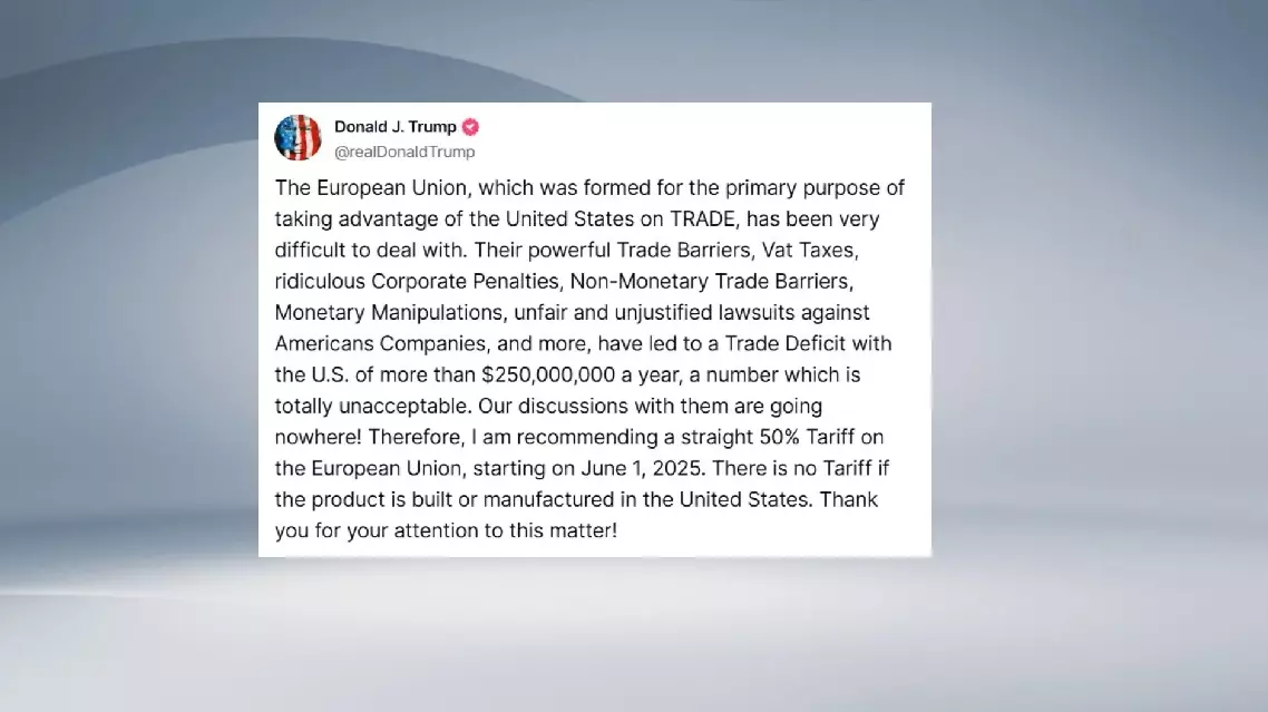 Trump said he is recommending a 50 percent tariff on all goods imported from the EU starting June 1, citing stalled negotiations with Brussels. "Trade talks are going nowhere," he wrote.