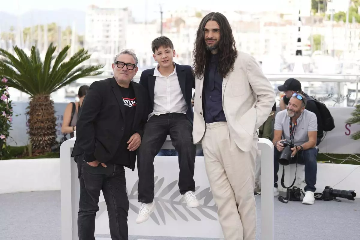 Sergi Lopez, from left, Bruno Nunez, and director Oliver Laxe pose for photographers at the photo call for the film 'Sirat' at the 78th international film festival, Cannes, southern France, Friday, May 16, 2025. (AP Photo/Natacha Pisarenko)