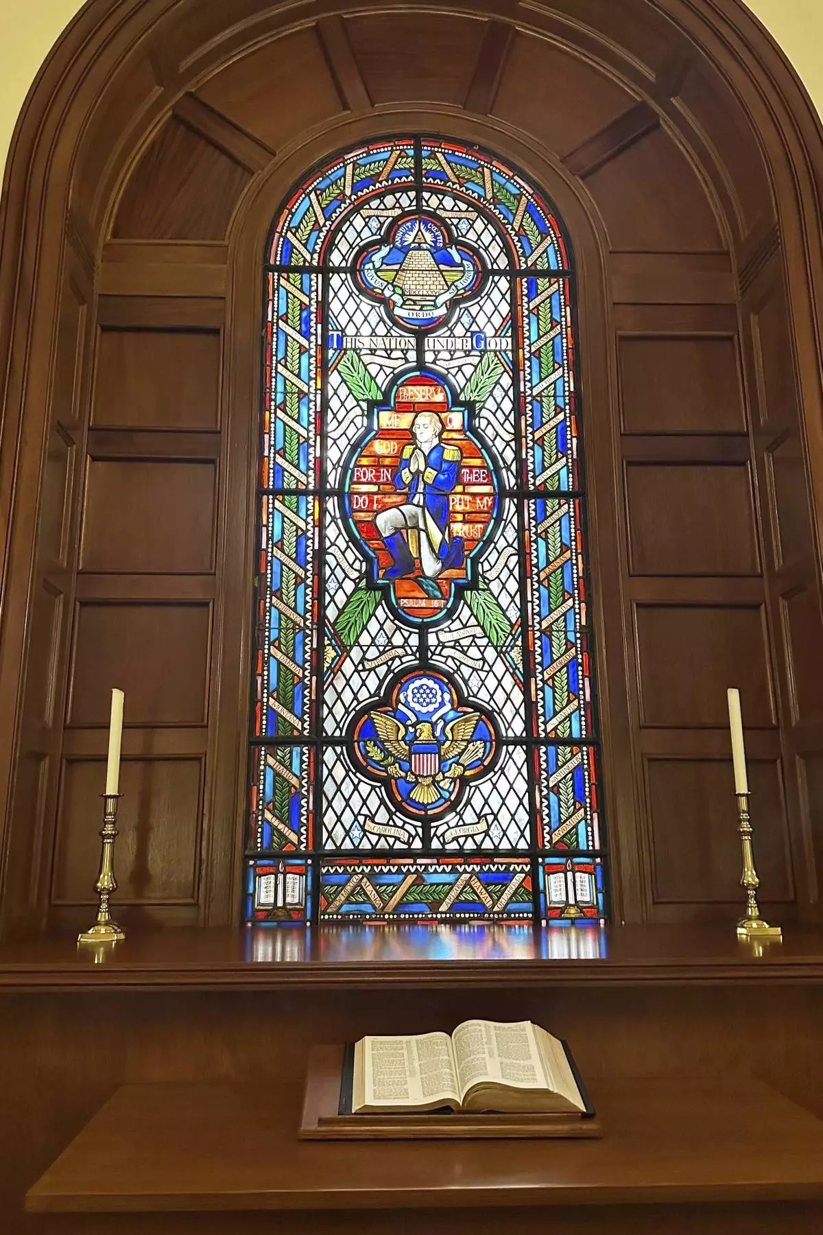 As Wednesday night had melted into Thursday morning, none other than George Washington, the first president himself, watched over the room, his tall figure bent on one knee in the stained-glass image high above a small altar.