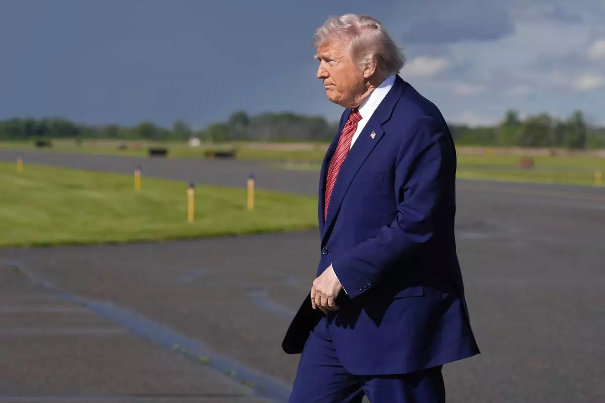President Donald Trump arrives on Air Force One at Morristown Municipal Airport in Morristown, N.J., Friday, May 23, 2025. (AP Photo/Manuel Balce Ceneta)