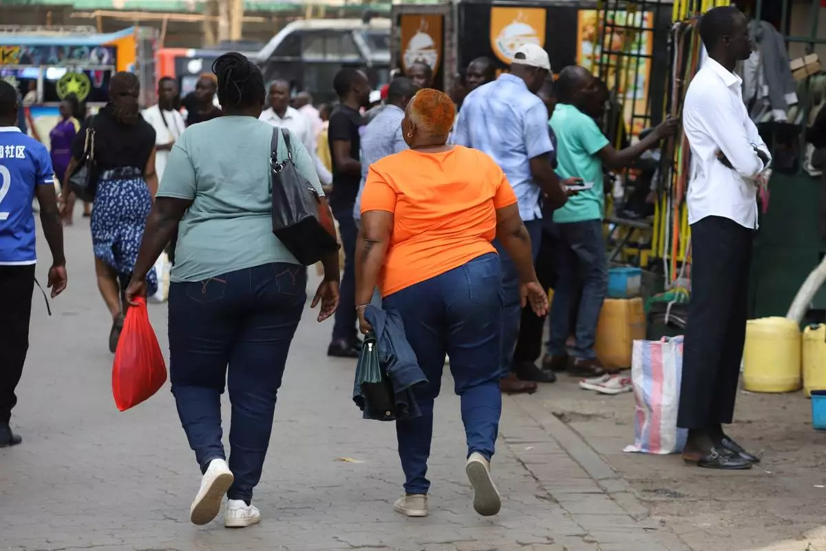 FILE - Women walk in the streets of Nairobi, Kenya, during World Obesity Day, March 4, 2025. (AP Photo/Andrew Kasuku, File)