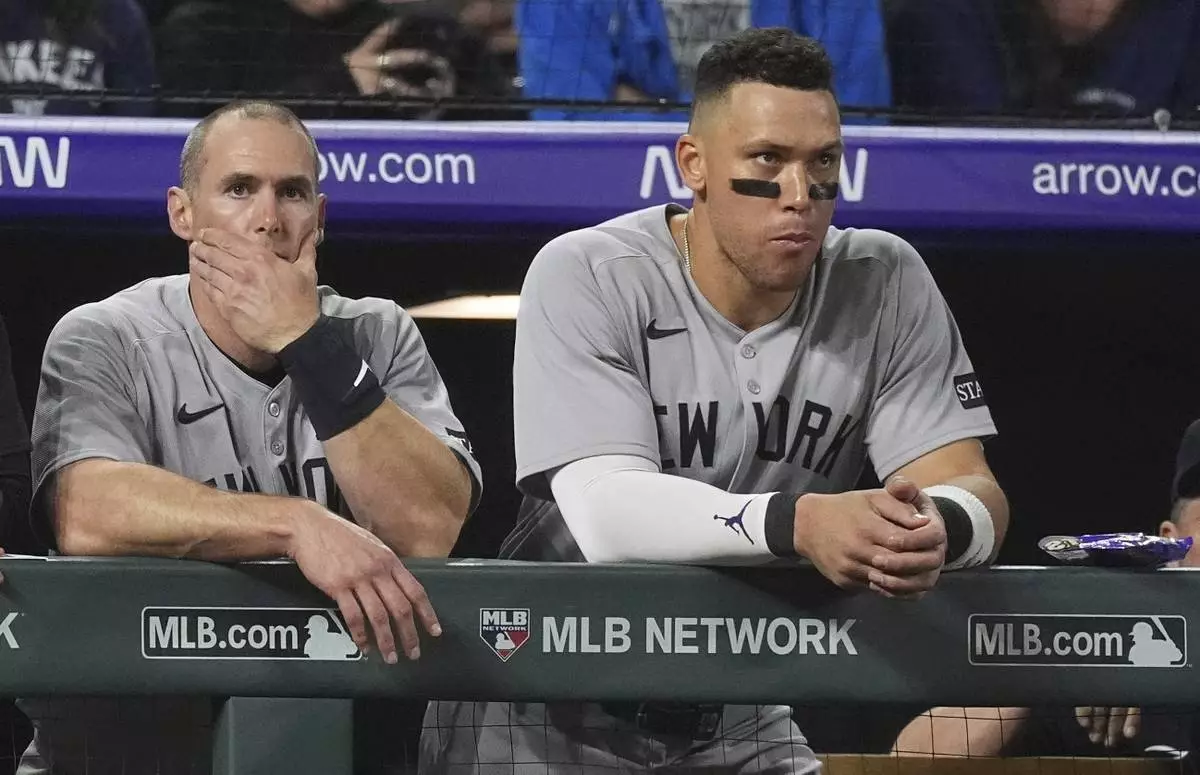 New York Yankees' Paul Goldschmidt, left, and Aaron Judge, right, lean over the dugout rail to watch the ninth inning of a baseball game against the Colorado Rockies, Friday, May 23, 2025, in Denver. (AP Photo/David Zalubowski)