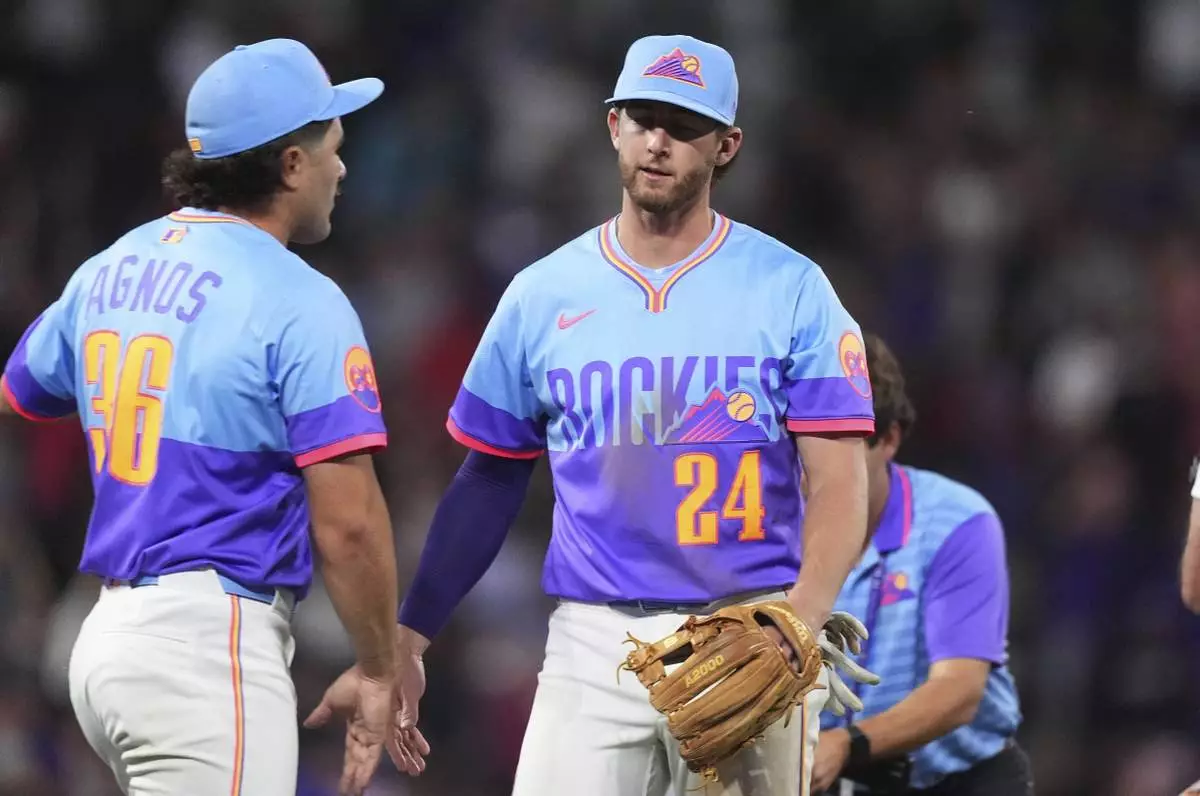 Colorado Rockies relief pitcher Zach Agnos, left, congratulates third baseman Ryan McMahon (24) after a baseball game against the New York Yankees, Friday, May 23, 2025, in Denver. (AP Photo/David Zalubowski)