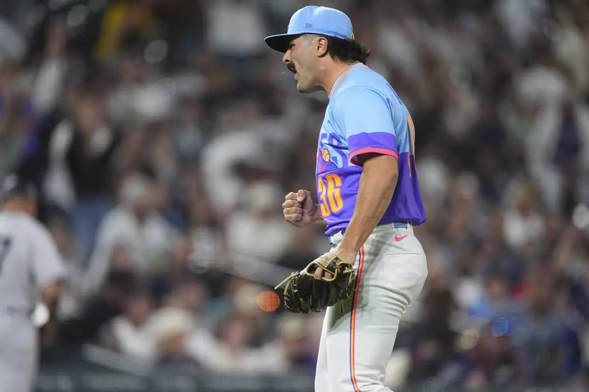 Colorado Rockies relief pitcher Zach Agnos reacts after retiring New York Yankees' Austin Wells to end a baseball game Friday, May 23, 2025, in Denver. (AP Photo/David Zalubowski)