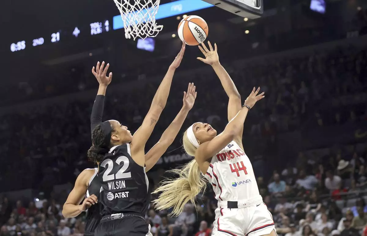 Washington Mystics forward Kiki Iriafen (44) shoots a layup against Las Vegas Aces center A'ja Wilson (22) during the first half of a WNBA basketball game Friday, May 23, 2025, in Las Vegas. (Steve Marcus/Las Vegas Sun via AP)