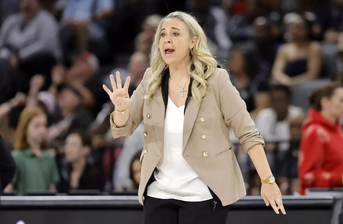 Las Vegas Aces head coach Becky Hammon calls to players during the first half of a WNBA basketball game against the Washington Mystics, Friday, May 23, 2025, in Las Vegas. (Steve Marcus/Las Vegas Sun via AP)