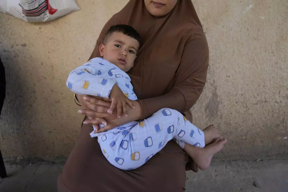 Palestinian Hazar Estity holds her 21-month-old son, Nizar, on April 29, 2025, in the West Bank town of Zababdeh, where they fled when the Jenin refugee camp was raided by the Israeli army. Estity says she was used as a human shield by Israeli soldiers there. (AP Photo/Nasser Nasser)