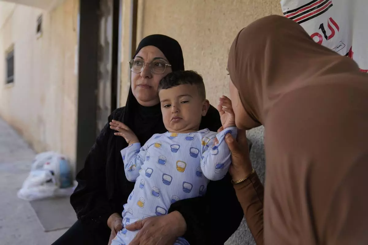 Palestinian Hazar Estity kisses her 21-month-old son, Nizar, who is being held by his grandmother, Nazek, on April 29, 2025, at an apartment in the West Bank town of Zababdeh. Estity says she was used as a human shield by Israeli soldiers. (AP Photo/Nasser Nasser)