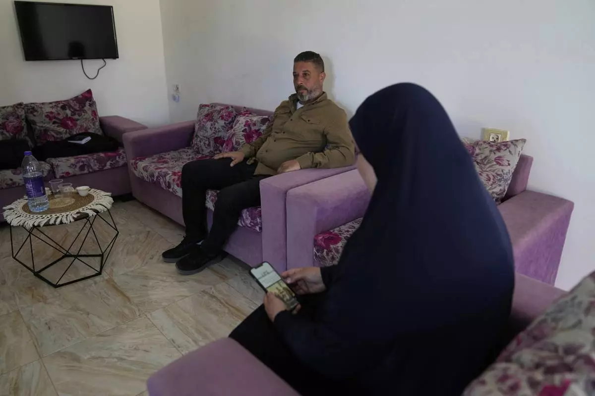 Palestinian Mohammad Amer and his wife, Iman, sit in an apartment, April 29, 2025, in the West Bank town of Zababdeh, where they fled when the Jenin refugee camp was raided by the Israeli army. Iman Amer says she was used as a human shield by Israeli soldiers there. (AP Photo/Nasser Nasser)