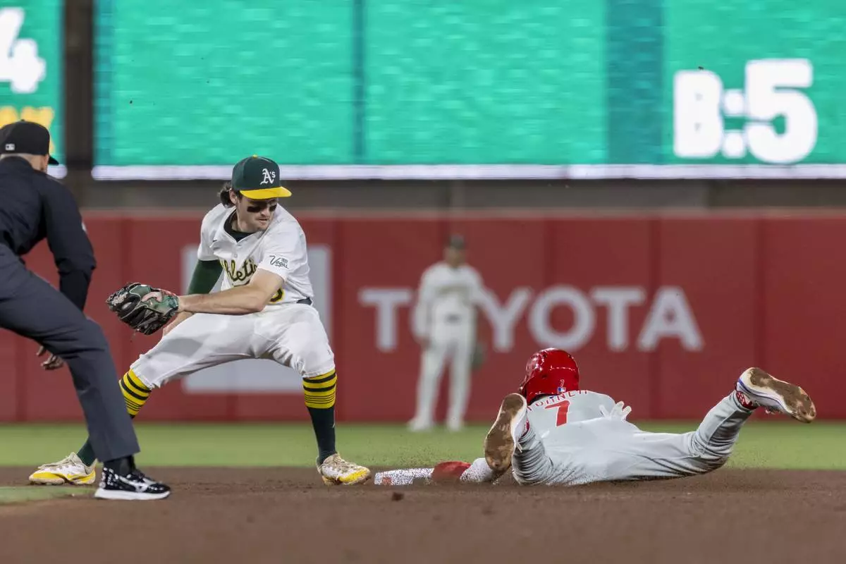 Athletics shortstop Jacob Wilson, left, attempts to tag out Philadelphia Phillies' Trea Turner (7) as he steals second base during the eighth inning of a baseball game, Friday, May 23, 2025, in West Sacramento, Calif. (AP Photo/Sara Nevis)