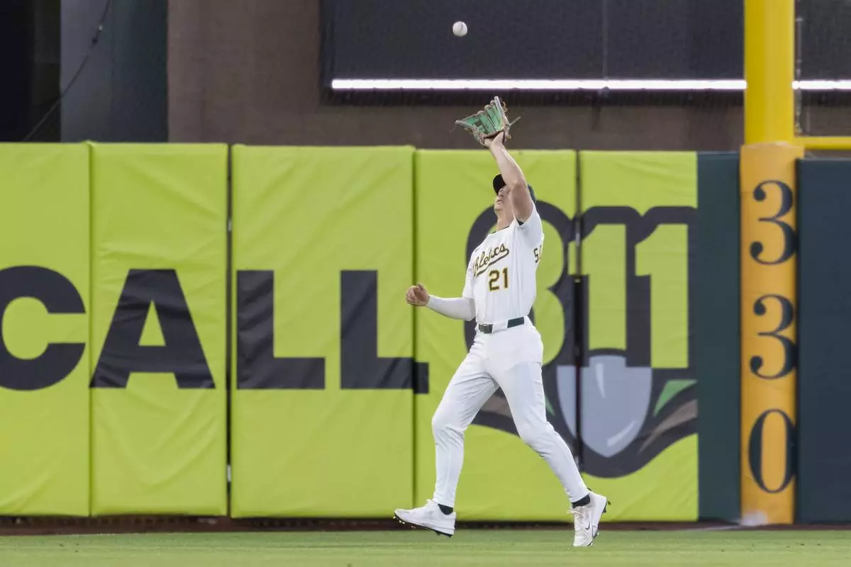 Athletics outfielder Tyler Soderstrom catches a fly ball during the fifth inning of a baseball game against the Philadelphia Phillies, Friday, May 23, 2025, in West Sacramento, Calif. (AP Photo/Sara Nevis)