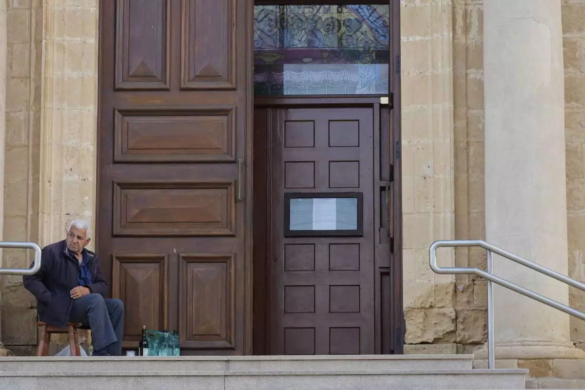 A man sits outside St. George Church in the Maronite village of Kormakitis in the breakaway north of the ethnically divided Cyprus on Wednesday, April 23, 2025. (AP Photo/Petros Karadjias)