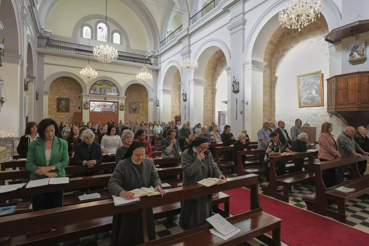 Maronite Catholic faithful attend a service on the Feast Day of St. George in St. George Church in the Maronite village of Kormakitis in the breakaway north of the ethnically divided Cyprus on Wednesday, April 23, 2025. (AP Photo/Petros Karadjias)