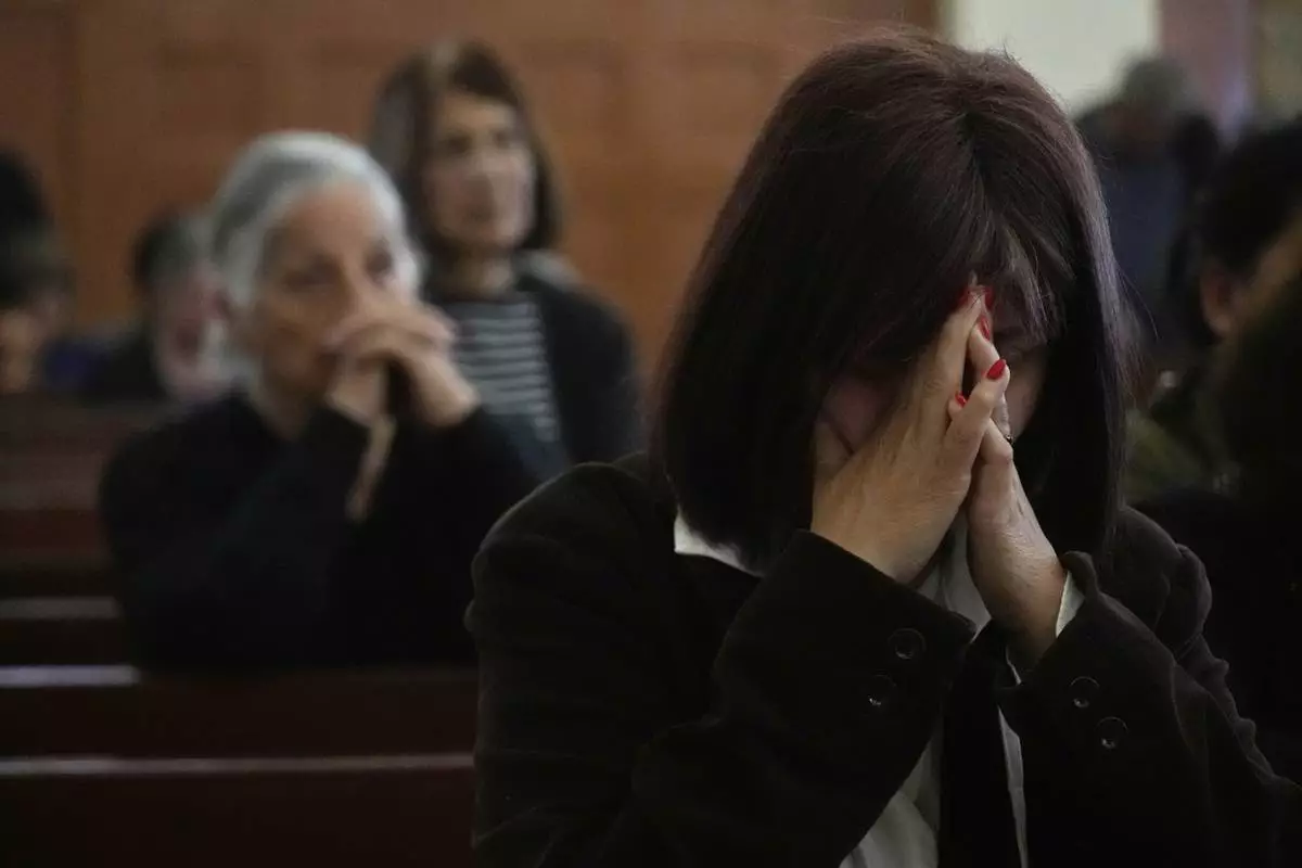 Maronite Catholic faithful bring their hands together in prayer during a service in outside St. George Church in the Maronite village of Kormakitis in the breakaway north of the ethnically divided Cyprus on Wednesday, April 23, 2025. (AP Photo/Petros Karadjias)