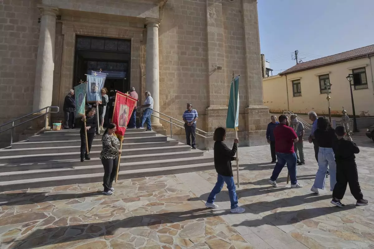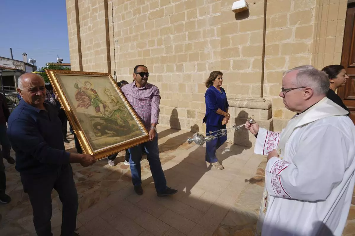 Worshippers follow a traditional procession on the Feast Day of St. George outside St. George Church in the Maronite village of Kormakitis in the breakaway north of the ethnically divided Cyprus on Wednesday, April 23, 2025. (AP Photo/Petros Karadjias)