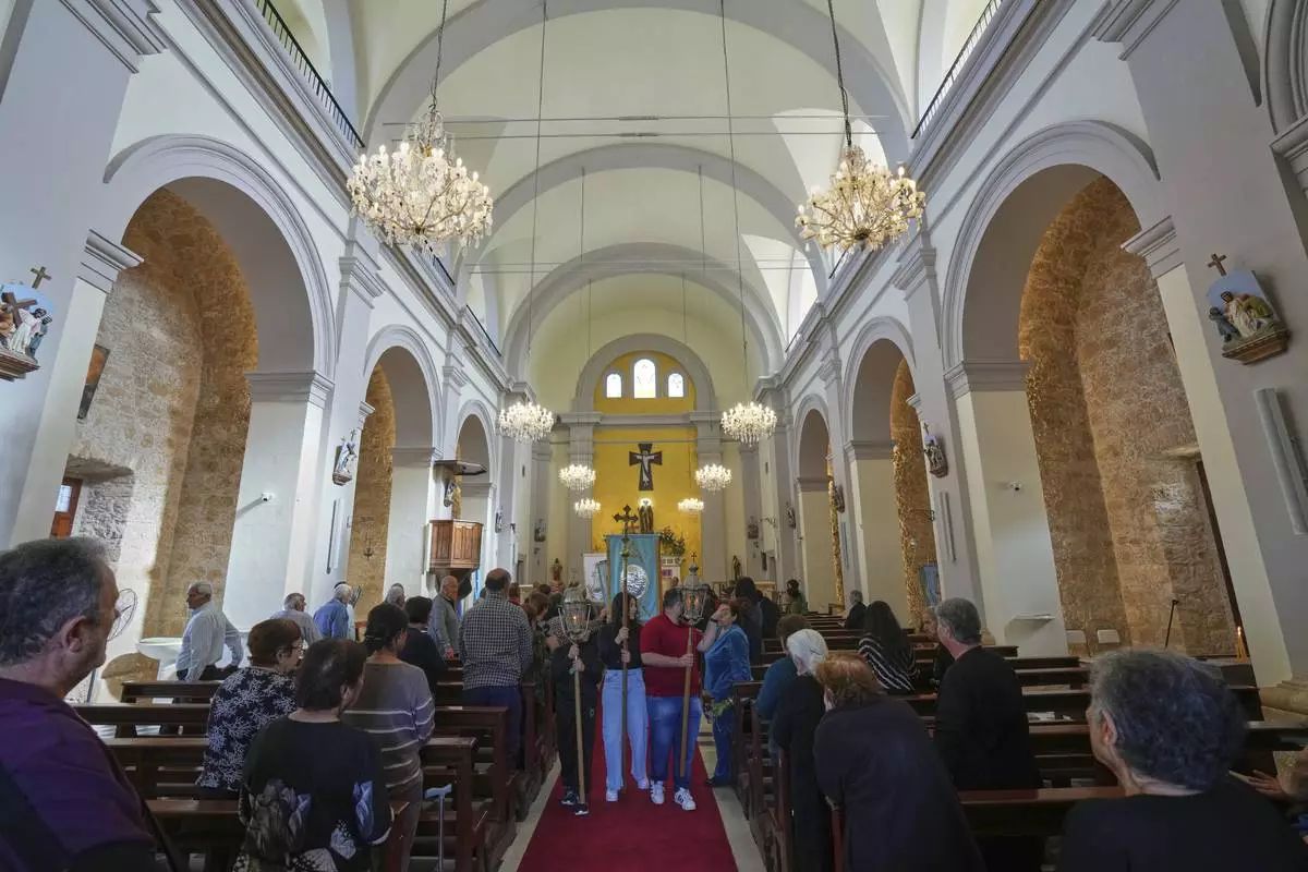 Faithful follow a traditional procession on the Feast Day of St. George in St. George Church in the Maronite village of Kormakitis in the breakaway north of the ethnically divided Cyprus on Wednesday, April 23, 2025. (AP Photo/Petros Karadjias)