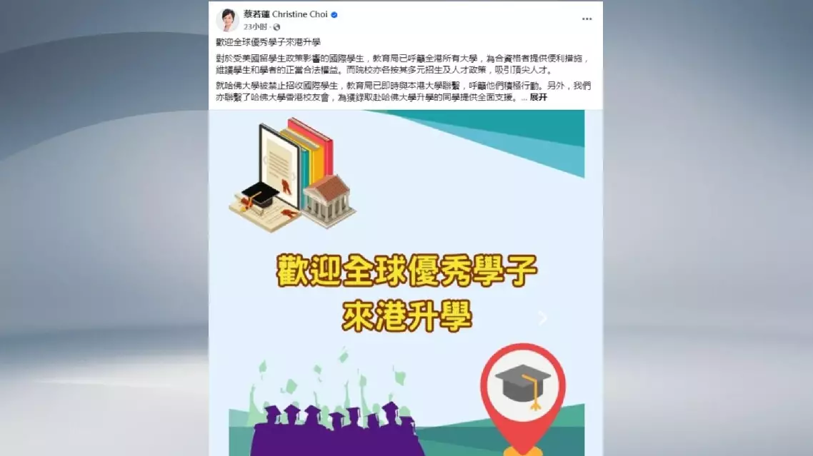 Hong Kong Secretary for Education Christine Choi Yuk-lin on Friday invited affected international students to continue their academic studies in the SAR and called on local universities to provide support for eligible students.