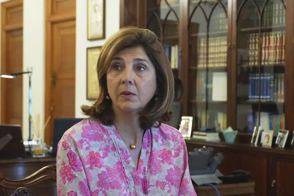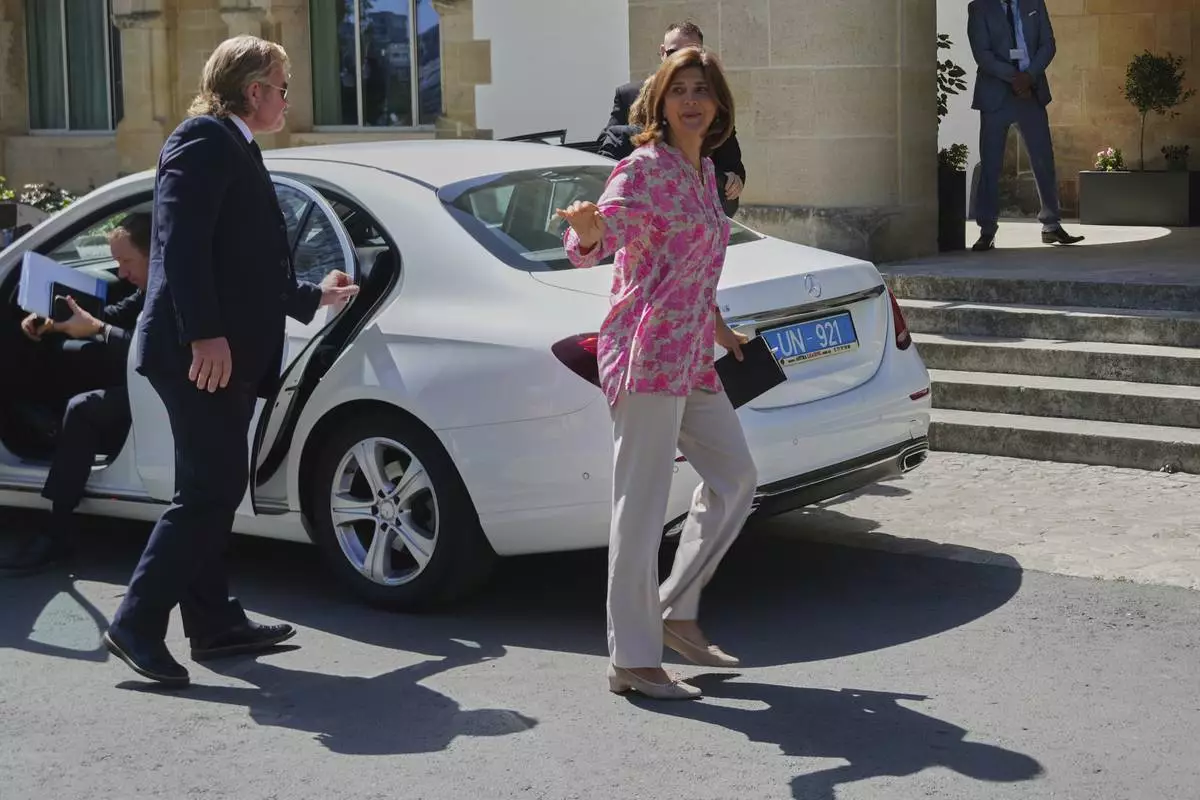 U.N. chief's personal envoy for Cyprus, Maria Angela Holguin Cuellar, arrives for a meeting with Cyprus' President Nikos Christodoulides at the Presidential Palace in the divided capital Nicosia, Cyprus, on Saturday, May 24, 2025. (AP Photo/Petros Karadjias)