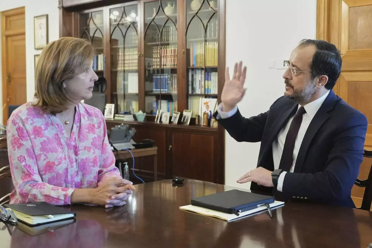 U.N. chief's personal envoy for Cyprus, Maria Angela Holguin Cuellar, left, and Cyprus' President Nikos Christodoulides talk during their meeting at the Presidential Palace in the divided capital Nicosia, Cyprus, on Saturday, May 24, 2025. (AP Photo/Petros Karadjias)