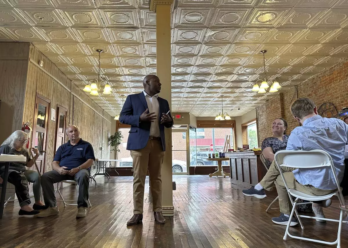 Kentucky Democratic Party Chairman Colmon Elridge addresses a "Rural Listening Tour" gathering in Paintsville, Ky., Friday, May 16, 2025. (AP Photo/Bill Barrow)