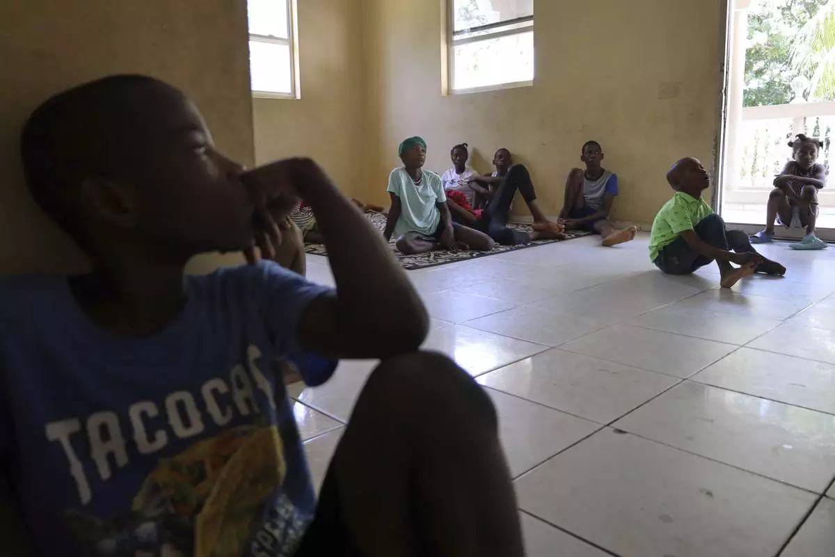 Children watch a movie after receiving their medication at the Caring for Haitian Orphans with AIDS orphanage, in Balan, Plaine-du-Nord, Haiti, Wednesday, May 21, 2025. (AP Photo/Patrice Noel)