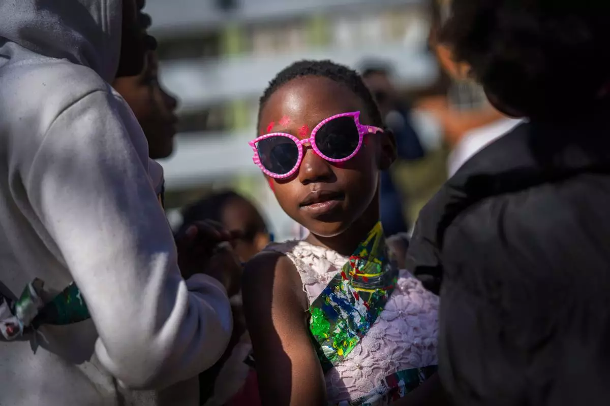 A young girl participates in the annual Hillbrow street parade organized by the Windybrow Arts Centre and other local organisations in downtown Johannesburg, South Africa, Saturday, May 24, 2025. (AP Photo/Jerome Delay)