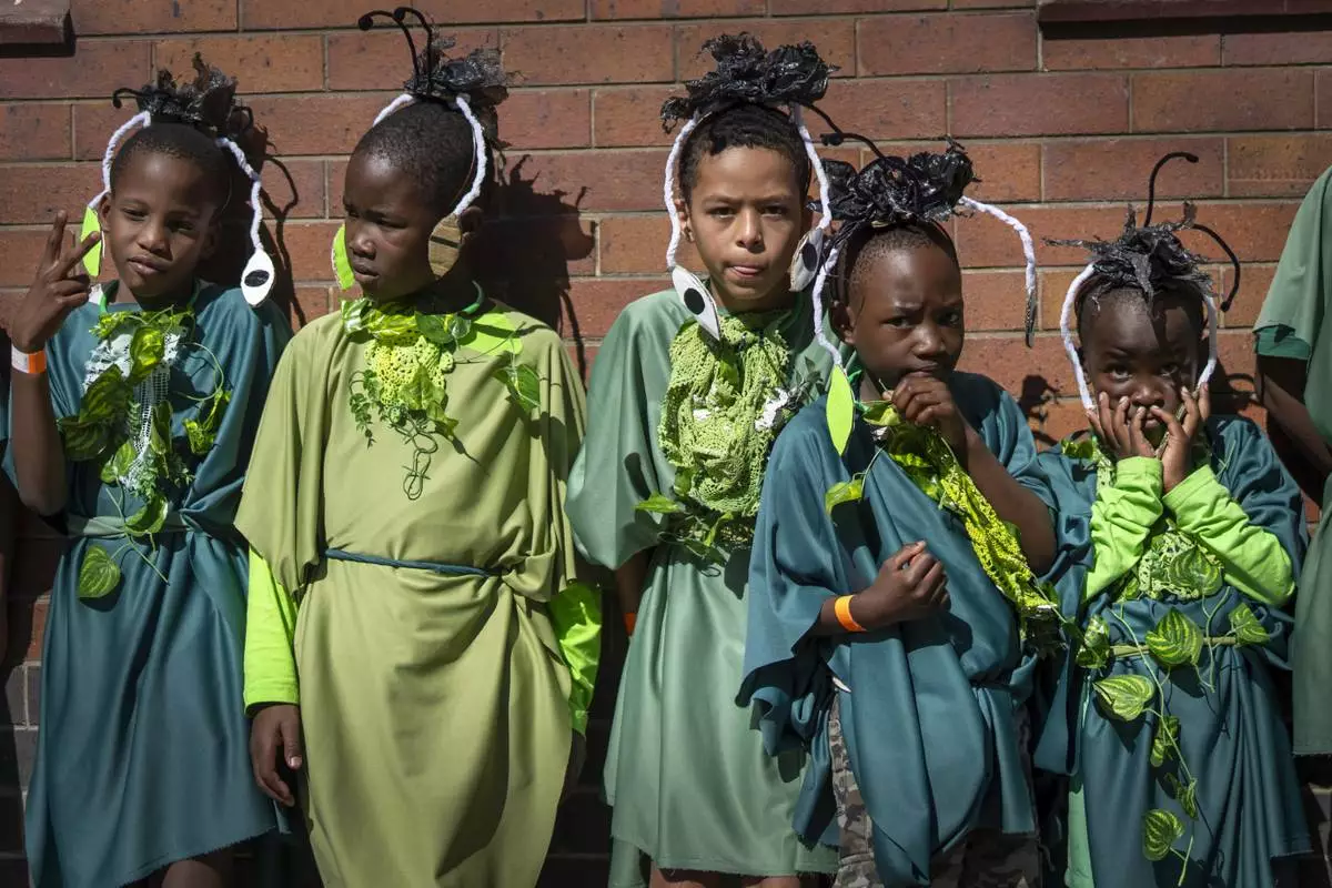 Children participate in the annual Hillbrow street parade organized by the Windybrow Arts Centre and other local organisations in downtown Johannesburg, South Africa, Saturday, May 24, 2025. (AP Photo/Jerome Delay)
