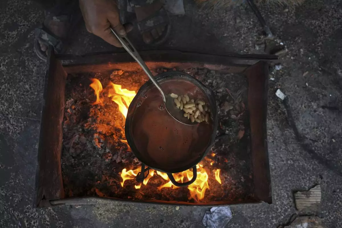 A Palestinian mother cooks beans over a fire fueled by burning plastic at a tent sheltering displaced families in Gaza City, Saturday, May 24, 2025. (AP Photo/Jehad Alshrafi)