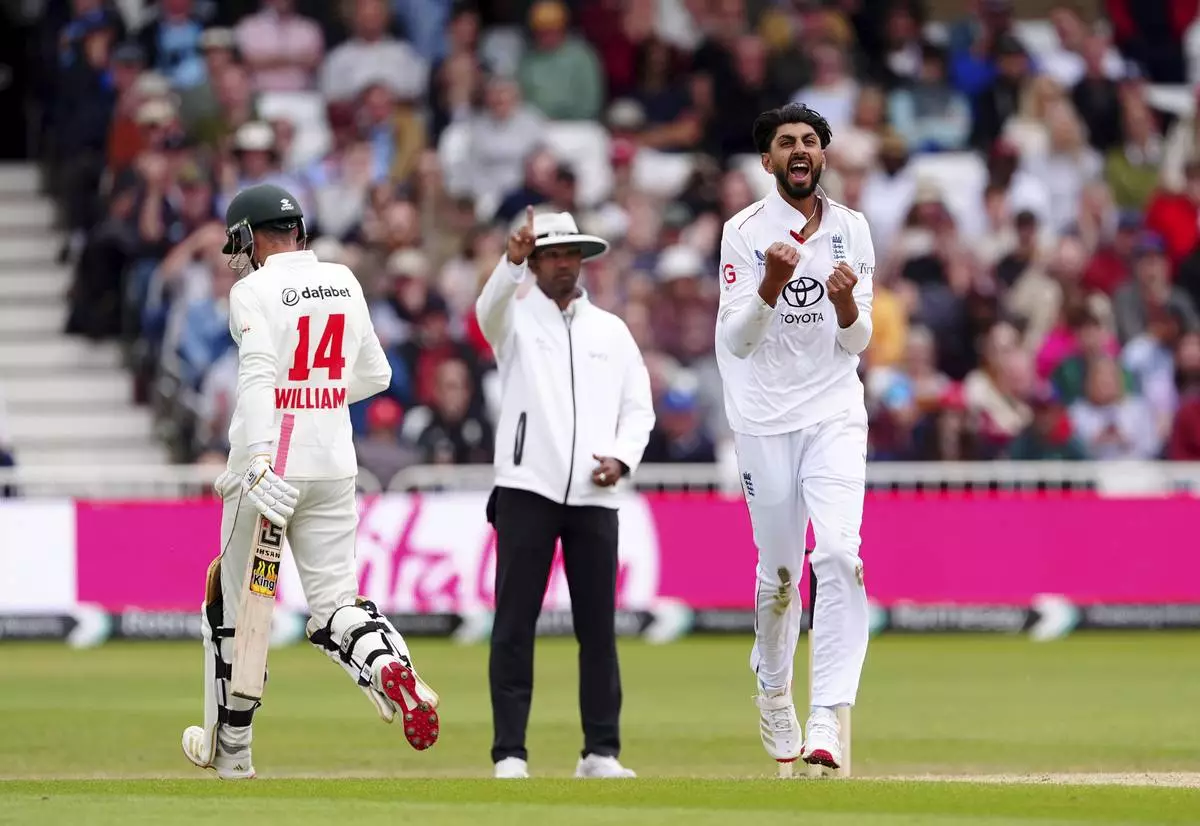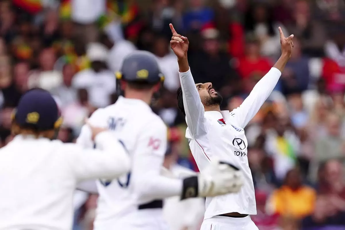 England's Shoaib Bashir celebrates taking the wicket of Zimbabwe's Sikandar Raza on day three on day three of the Rothesay International Test match between England and Zimbabwe at Trent Bridge, Nottingham, England, Saturday, May 24, 2025. (Mike Egerton/PA via AP)