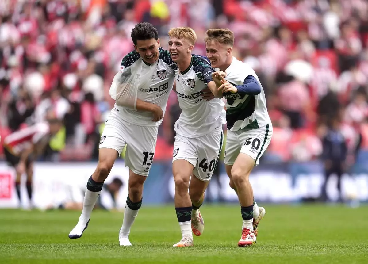 Sunderland's Luke O'Nien, Tom Watson and Harrison Jones celebrate following the Sky Bet Championship play off final between Sheffield United and Sunderland, at Wembley Stadium, London, Saturday May 24, 2025. (Nick Potts/PA via AP)