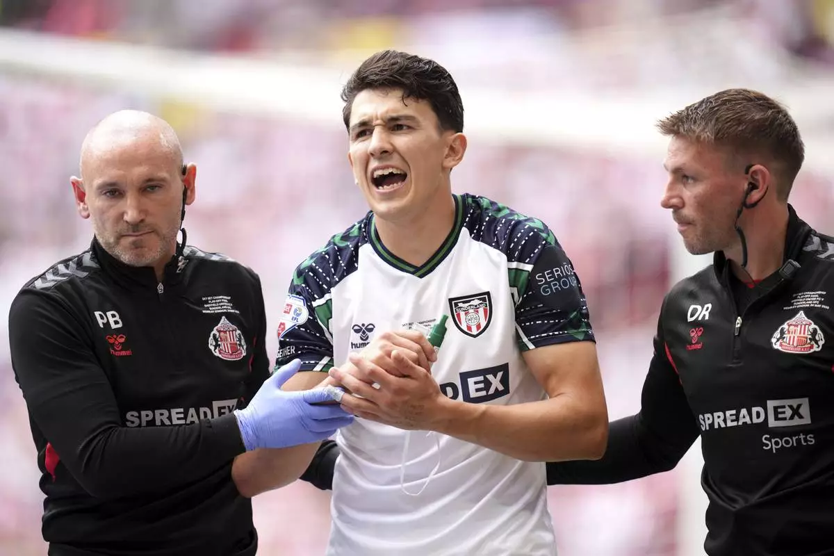 Sunderland's Luke O'Nien receives treatment for an injury during the Sky Bet Championship play off final between Sheffield United and Sunderland, at Wembley Stadium, London, Saturday May 24, 2025. (Ben Whitley/PA via AP)