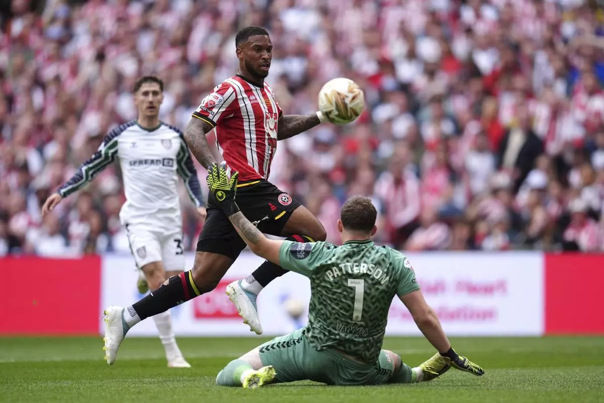 Sheffield United's Tyrese Campbell scores his side's first goal of the game during the Sky Bet Championship play off final between Sheffield United and Sunderland, at Wembley Stadium, London, Saturday May 24, 2025. (John Walton/PA via AP)