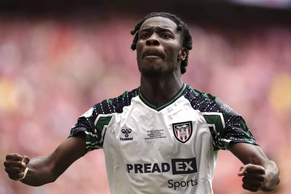 Sunderland's Eliezer Mayenda celebrates scoring his side's first goal during the Sky Bet Championship play off final between Sheffield United and Sunderland, at Wembley Stadium, London, Saturday May 24, 2025. (John Walton/PA via AP)