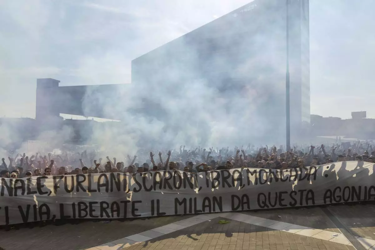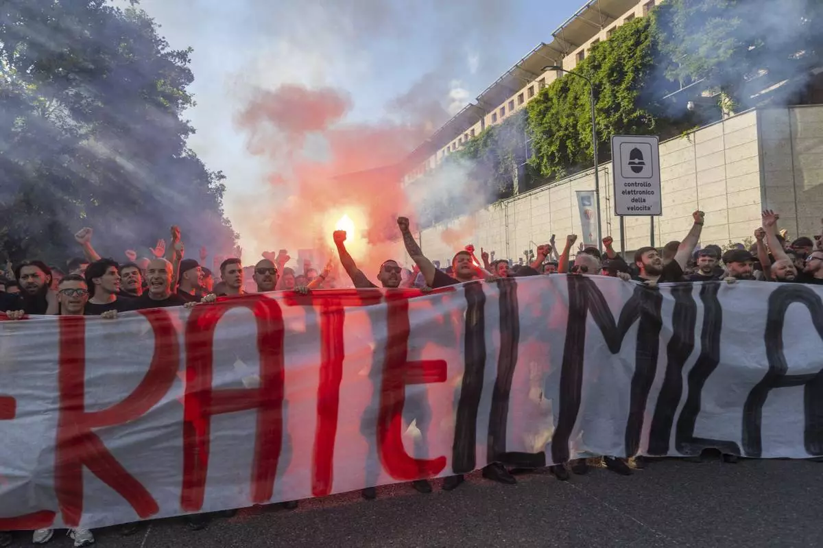AC Milan fans hold a protest in the square of the Portello area of Milan, Italy near the club's headquarters on Saturday, May 24, 2025. (Stefano Porta/LaPresse via AP)