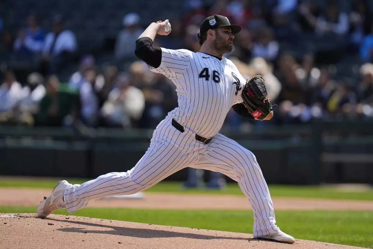 Chicago White Sox starting pitcher Bryse Wilson (46) throws against the Texas Rangers during the first inning of a baseball game Saturday, May 24, 2025, in Chicago. (AP Photo/Erin Hooley)