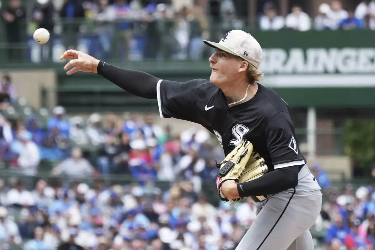 Chicago White Sox starting pitcher Jonathan Cannon throws against the Chicago Cubs during the first inning of a baseball game in Chicago, Sunday, May 18, 2025. (AP Photo/Nam Y. Huh)