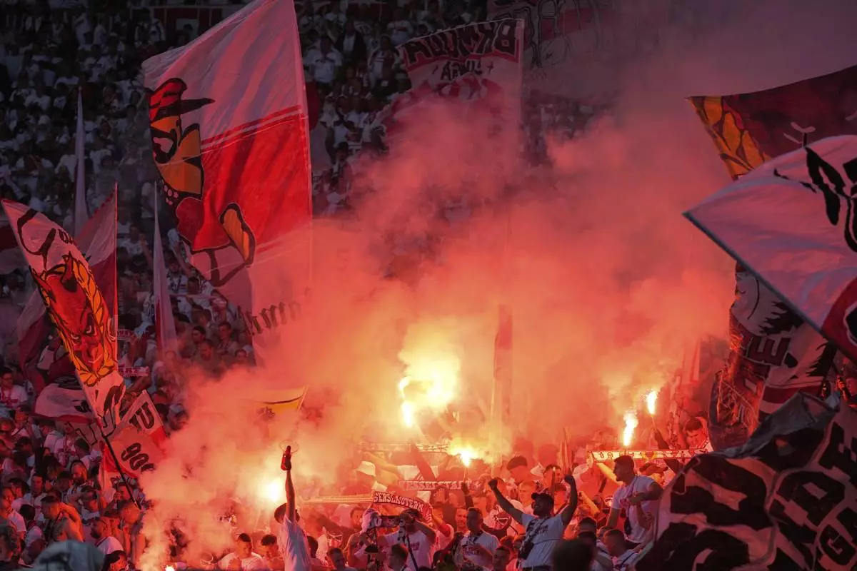 The Stuttgart players and coach Sebastian Hoeneß ran to their supporters after the final whistle to be feted with more flares and fireworks in front of masked ultras. A long line of police and stewards stood just behind the players, keeping a careful watch.