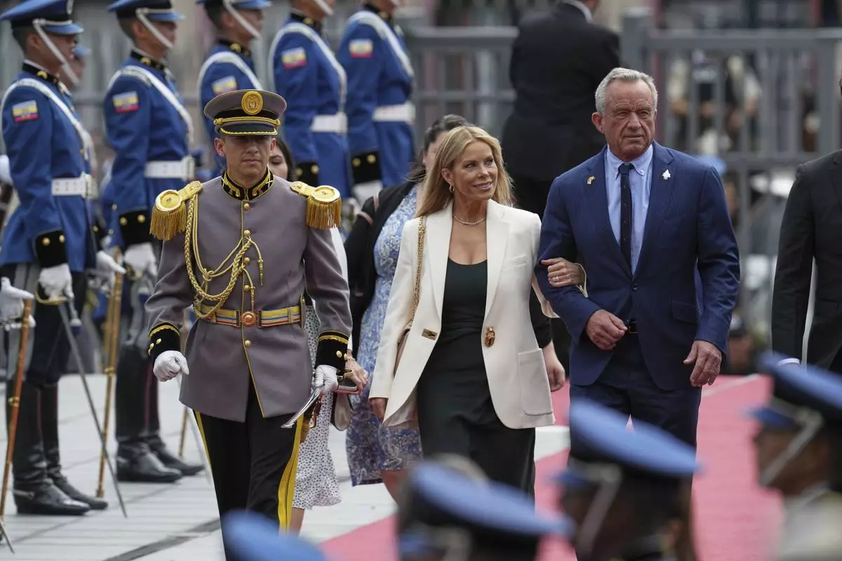 U.S. Secretary of Health and Human Services Robert Kennedy Jr. and his wife Cheryl Hines arrive for the swearing-in ceremony for a second term of Ecuador's President Daniel Noboa at the National Assembly in Quito, Ecuador, Saturday, May 24, 2025. (AP Photo/Dolores Ochoa)