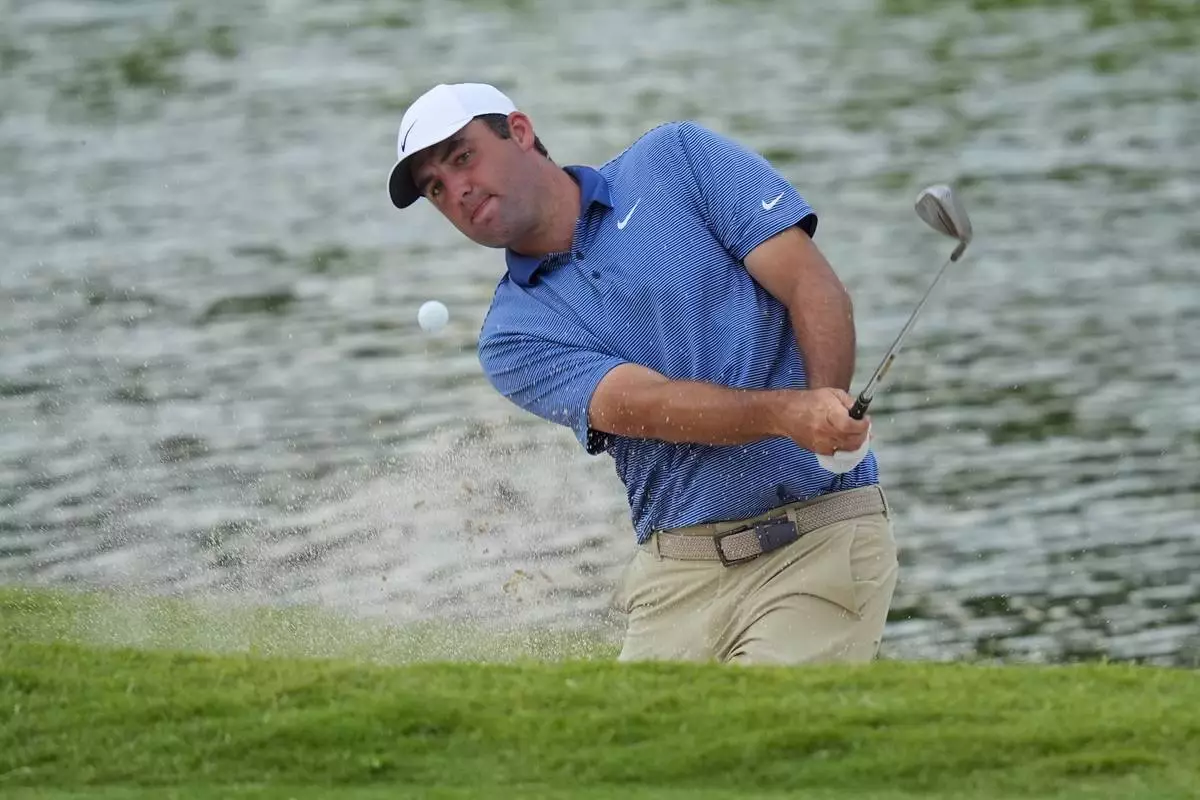 But Scheffler didn’t avoid bogeys after tee shots into bunkers at Nos. 12 and 13. He eventually two-putted from 40 feet at the 453-yard 12th hole, then his tee shot at the par-3 13th went into the sand fronting the green on the edge of a pond. He hit that within 5 feet, but missed the par save and after tapping in the bogey batted the ball out of the air and off the green with his putter.