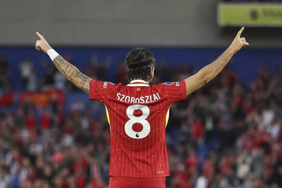 Liverpool's Dominik Szoboszlai celebrates after scoring his side's second goal during the English Premier League soccer match between Brighton and Liverpool at American Express Stadium in Brighton, England, Monday, May 19, 2025. (AP Photo/Ian Walton)