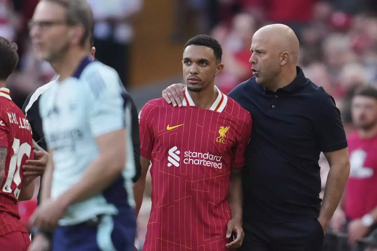 Liverpool's manager Arne Slot, right, gives instructions to Liverpool's Trent Alexander-Arnold during the English Premier League soccer match between Liverpool and Arsenal, at Anfield stadium in Liverpool, England, Sunday, May 11, 2025. (AP Photo/Jon Super)