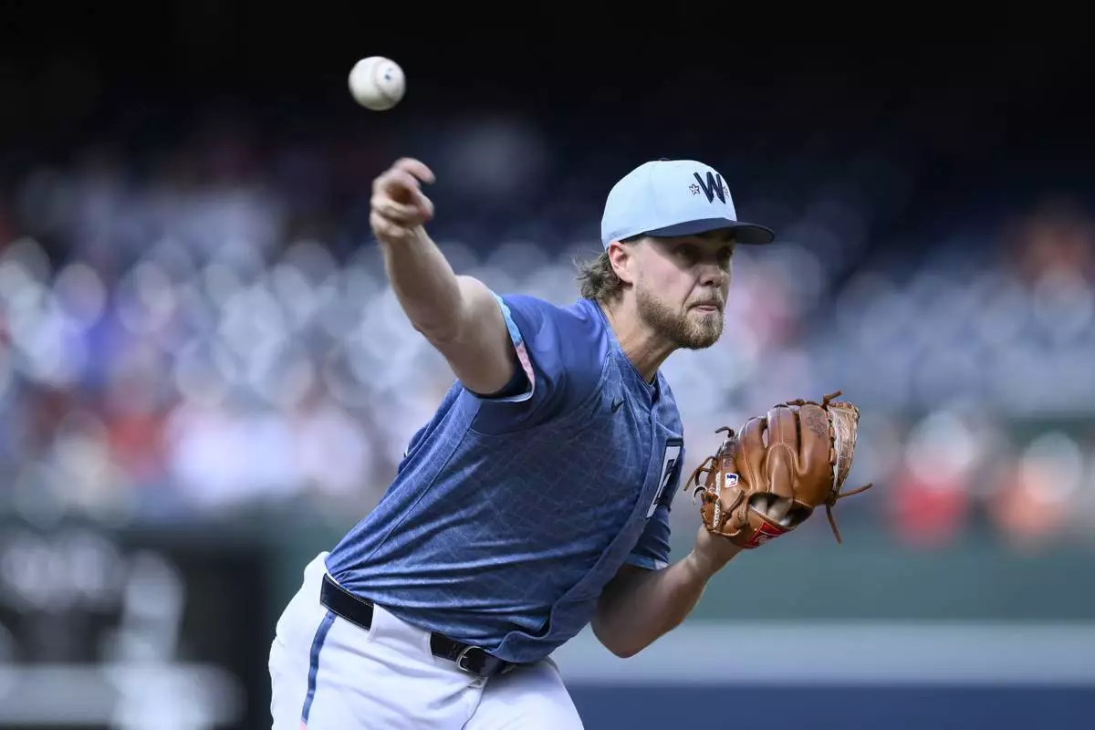 Washington Nationals starting pitcher Jake Irvin throws during the first inning of a baseball game against the San Francisco Giants, Saturday, May 24, 2025, in Washington. (AP Photo/Nick Wass)