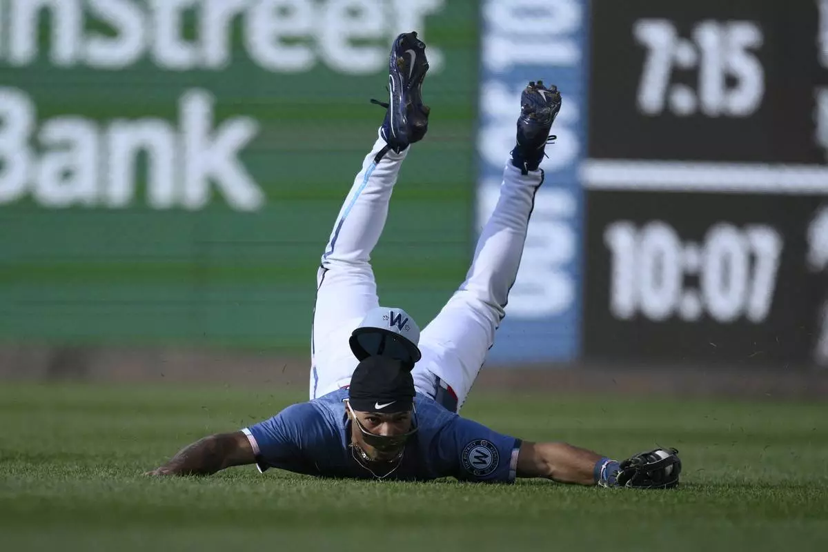 Washington Nationals right fielder Daylen Lile slides on the grass after he made a catch on a fly ball hit by San Francisco Giants' Matt Chapman for the out during the ninth inning of a baseball game, Saturday, May 24, 2025, in Washington. (AP Photo/Nick Wass)