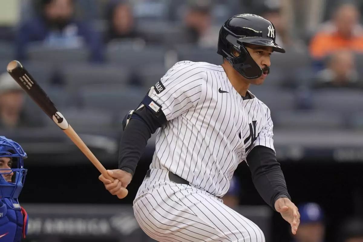 New York Yankees' Trent Grisham hits a single during the fifth inning of a baseball game against the Texas Rangers, Thursday, May 22, 2025, in New York. (AP Photo/Frank Franklin II)