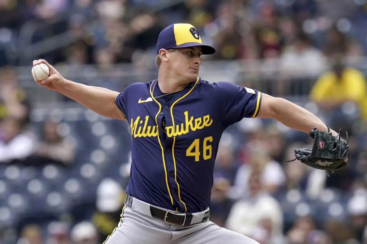 Milwaukee Brewers pitcher Quinn Priester delivers during the first inning of a baseball game against the Pittsburgh Pirates Saturday, May 24, 2025, in Pittsburgh. (AP Photo/Matt Freed)