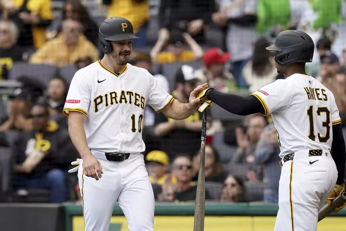 Pittsburgh Pirates' Bryan Reynolds, left, is greeted by Ke'Bryan Hayes, right, after scoring during the first inning of a baseball game against the Milwaukee Brewers, Saturday, May 24, 2025, in Pittsburgh. (AP Photo/Matt Freed)