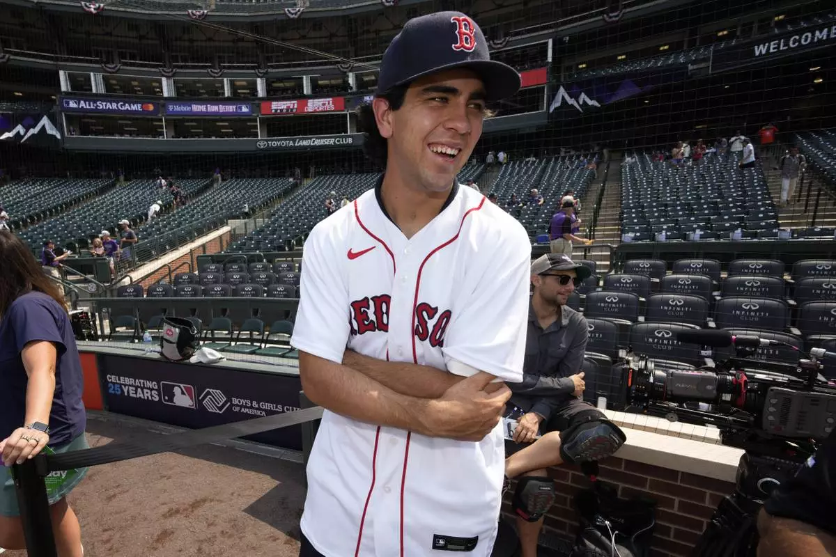 FILE - Boston Red Sox first round draft pick Marcelo Mayer watches batting practice for the MLB All-Star baseball game, Monday, July 12, 2021, in Denver. (AP Photo/David Zalubowski,File)