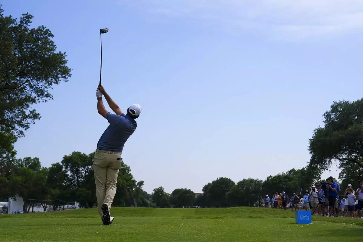 Matti Schmid watches his shot off the first tee during the first round of the Charles Schwab Challenge golf tournament at Colonial Country Club in Fort Worth, Texas, Thursday, May 22, 2025. (AP Photo/Julio Cortez)